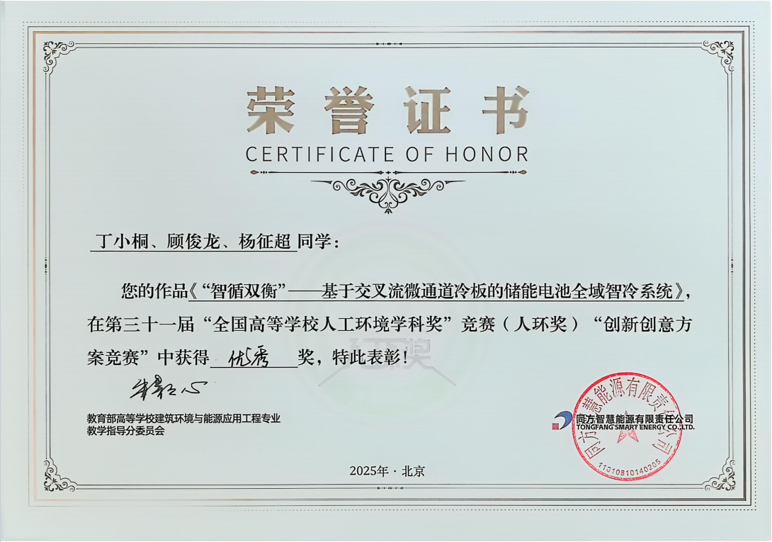 8月28-29日,第31届全国高等学校人工环境学科奖竞赛(简称“人环奖”)在北京举行。由王瑜副教授指导,硕士生丁小桐、顾俊龙、杨征超完成的参赛作品《“智循双衡”—基于交叉流微通道冷板的储能电池全域智冷系统》荣获“创新创意方案竞赛”赛道优秀奖。作品聚焦储能电池冷却系统技术难题,开发了高效协同智冷系统,为大型储能电池组的安全运维和节能降耗提供了创新解决方案。